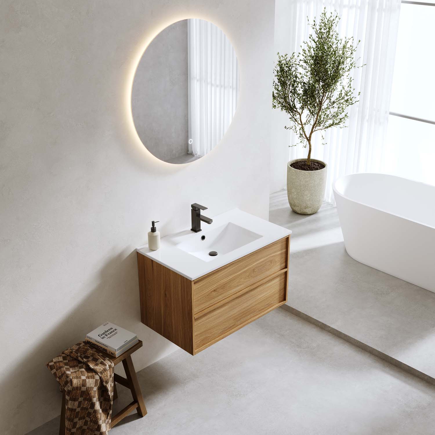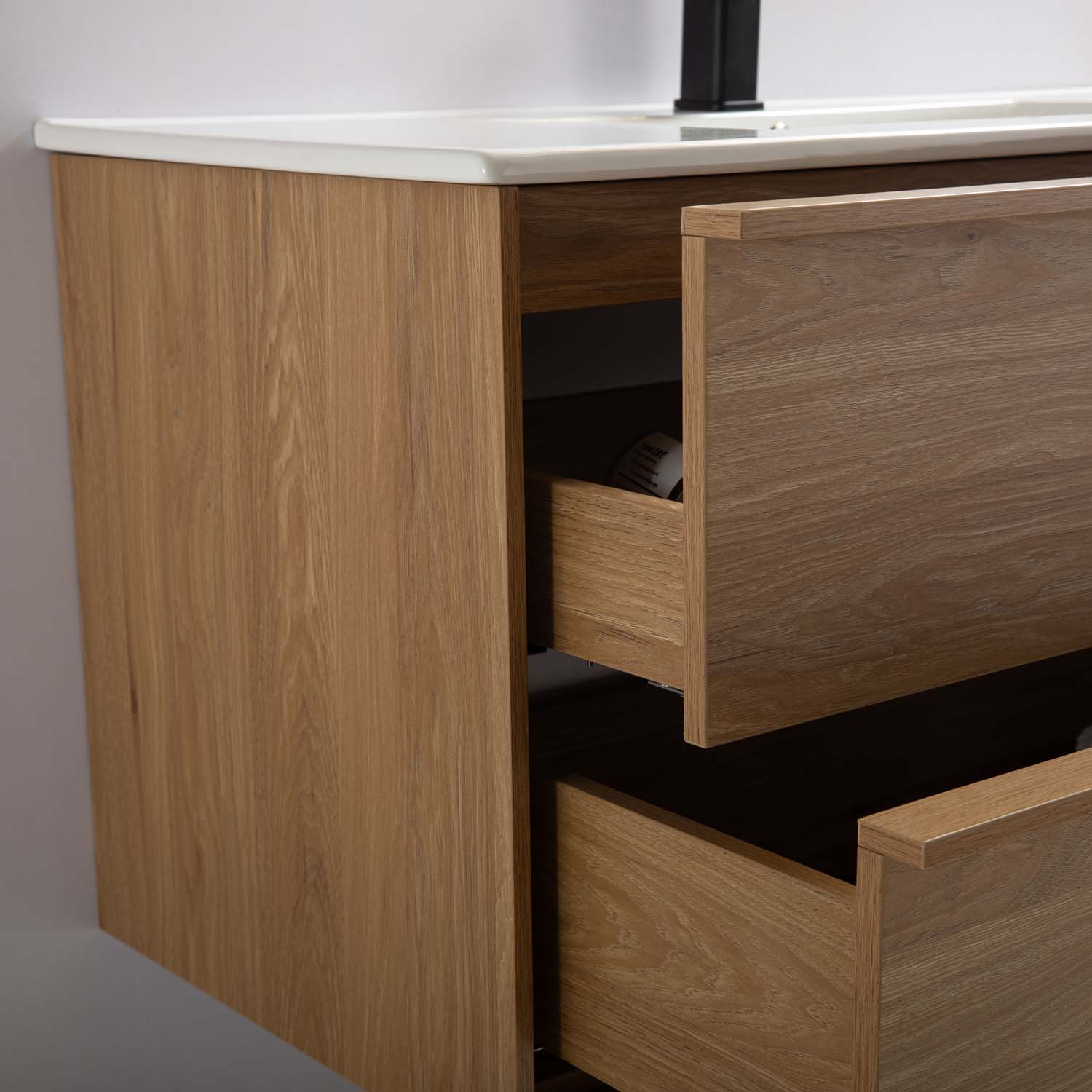 Bathlife Charm servantskap med servant er et moderne og elegant servantskap med fine detaljer som en tynn ramme rundt, integrerte grepslister på de mykt lukkende skuffene og en vakker tremønstret overflate. Skapet er laget av melaminbelagt MDF, og den tilhørende servanten er laget av hvitt porselen. Skapet gir god oppbevaringsplass i de to skuffene som har myk stenging. Leveres ferdig montert, inkludert servant i porselen. Kjøp til bunnventil, servantbatteri og avløpssett. Dette produktet er utviklet i Sverige av Bathlife, med mål om å levere et prisgunstig kvalitetsprodukt du kan stole på og ha glede av i lang tid.