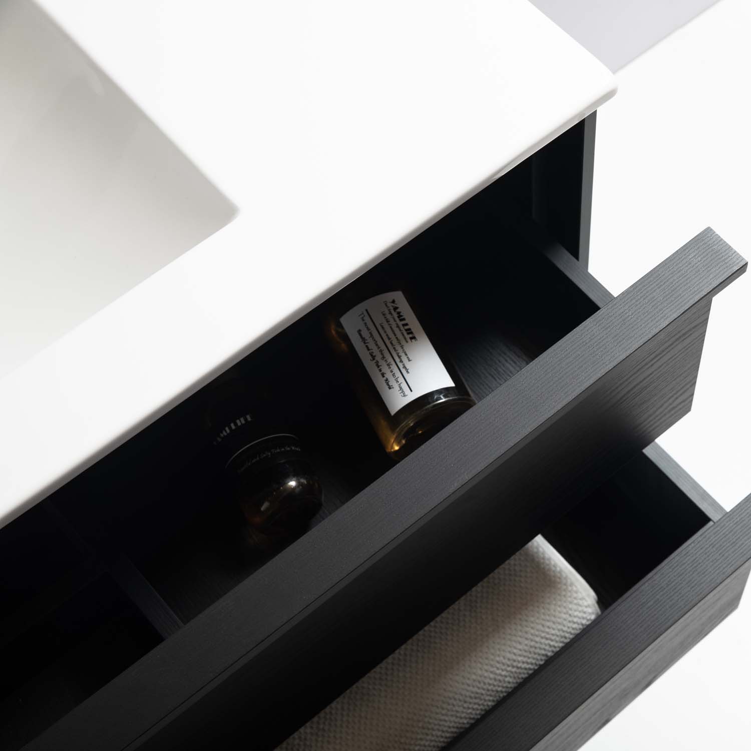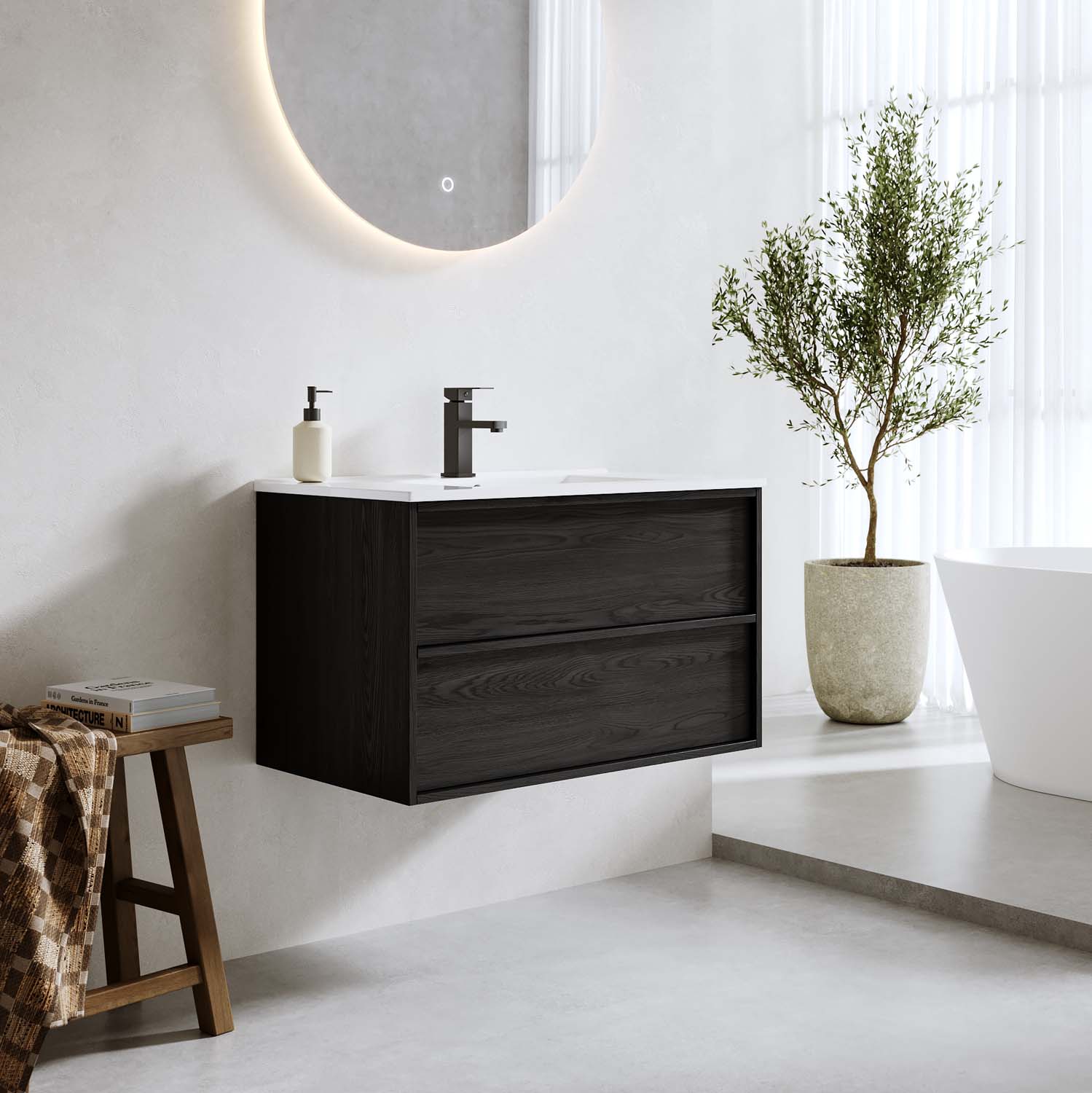 Bathlife Charm servantskap med servant er et moderne og elegant servantskap med fine detaljer som en tynn ramme rundt, integrerte grepslister på de mykt lukkende skuffene og en vakker tremønstret overflate. Skapet er laget av melaminbelagt MDF, og den tilhørende servanten er laget av hvitt porselen. Skapet gir god oppbevaringsplass i de to skuffene som har myk stenging. Leveres ferdig montert, inkludert servant i porselen. Kjøp til bunnventil, servantbatteri og avløpssett. Dette produktet er utviklet i Sverige av Bathlife, med mål om å levere et prisgunstig kvalitetsprodukt du kan stole på og ha glede av i lang tid.
