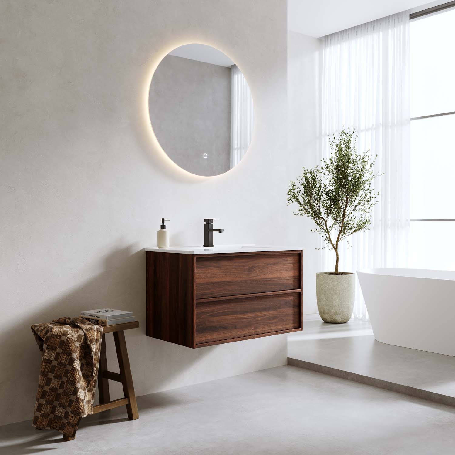 Bathlife Charm servantskap med servant er et moderne og elegant servantskap med fine detaljer som en tynn ramme rundt, integrerte grepslister på de mykt lukkende skuffene og en vakker tremønstret overflate. Skapet er laget av melaminbelagt MDF, og den tilhørende servanten er laget av hvitt porselen. Skapet gir god oppbevaringsplass i de to skuffene som har myk stenging. Leveres ferdig montert, inkludert servant i porselen. Kjøp til bunnventil, servantbatteri og avløpssett. Dette produktet er utviklet i Sverige av Bathlife, med mål om å levere et prisgunstig kvalitetsprodukt du kan stole på og ha glede av i lang tid.