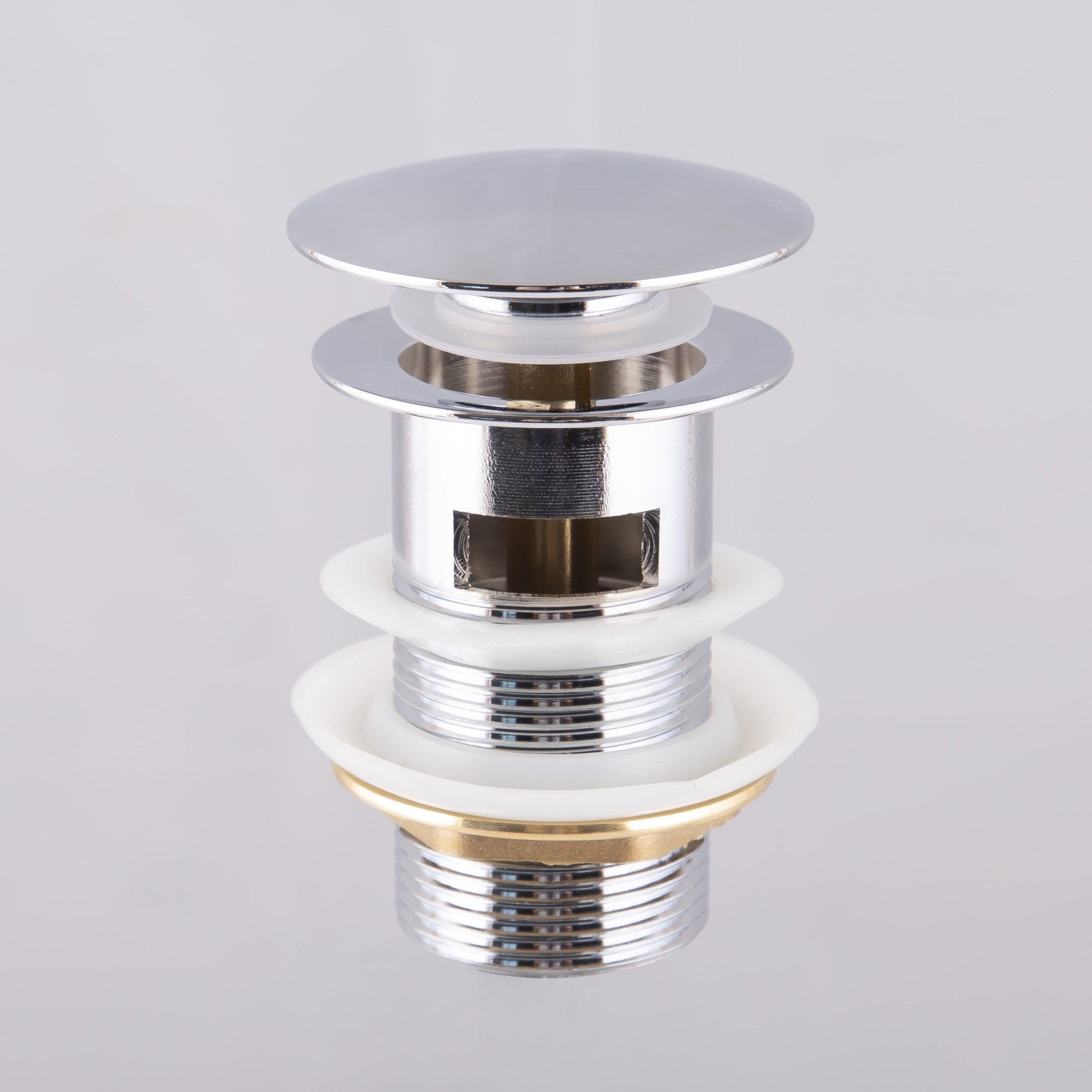 Bunnventil Bathlife med breddeavløp som passer til Bathlife servanter. Lokket har en fjæring, og bunnventilen åpnes og lukkes ved å trykke ned lokket.