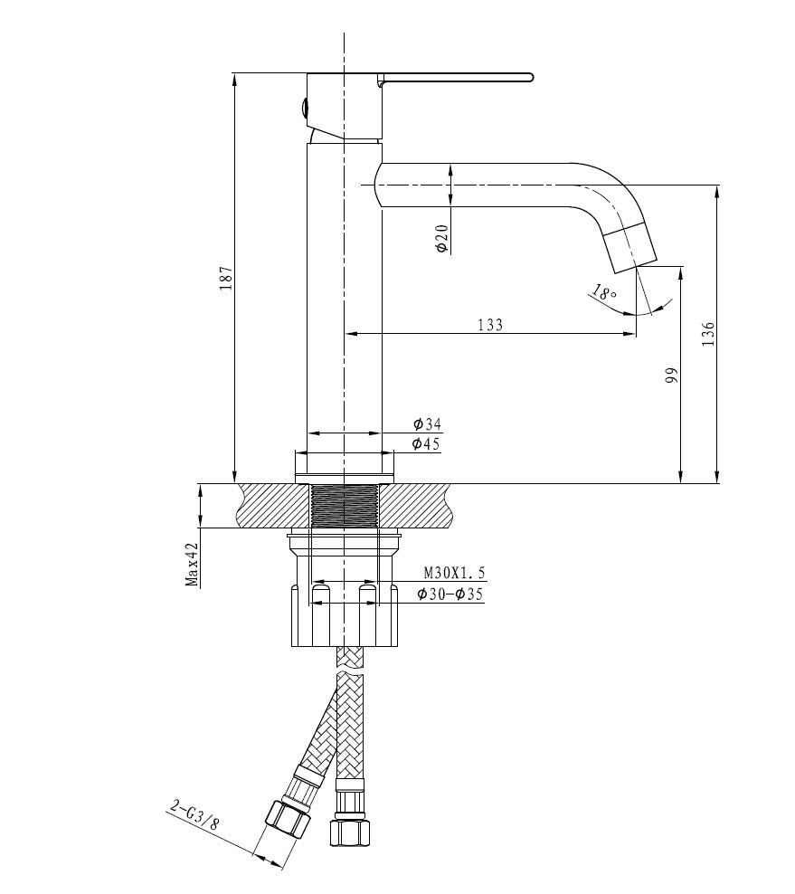 - Hulldiameter for montering i servant eller benkeplate, 32-35 mm.